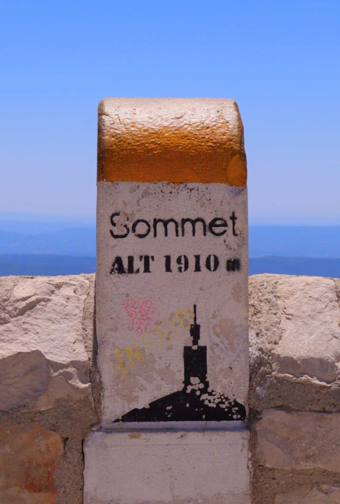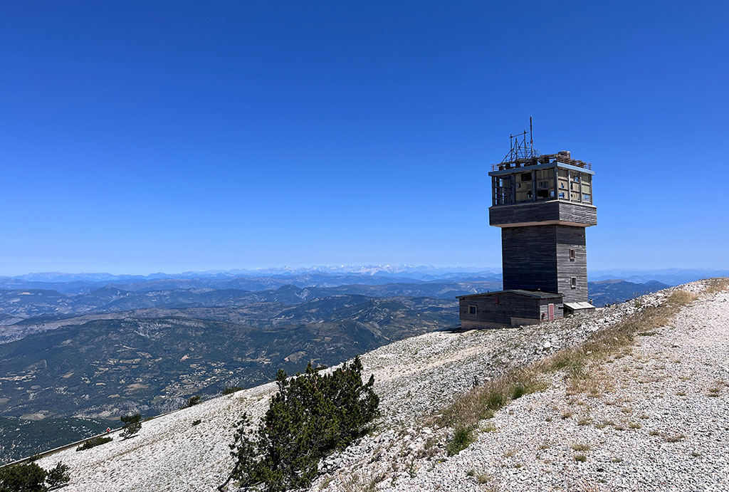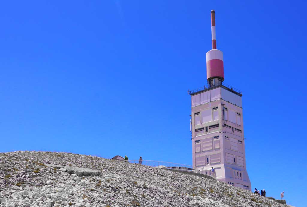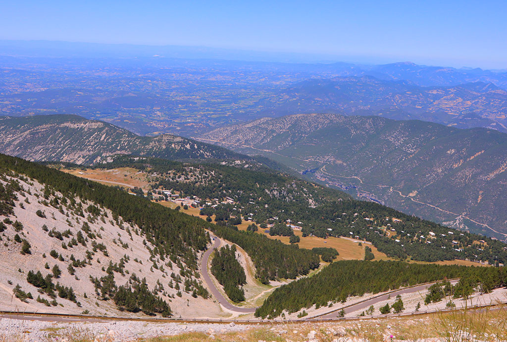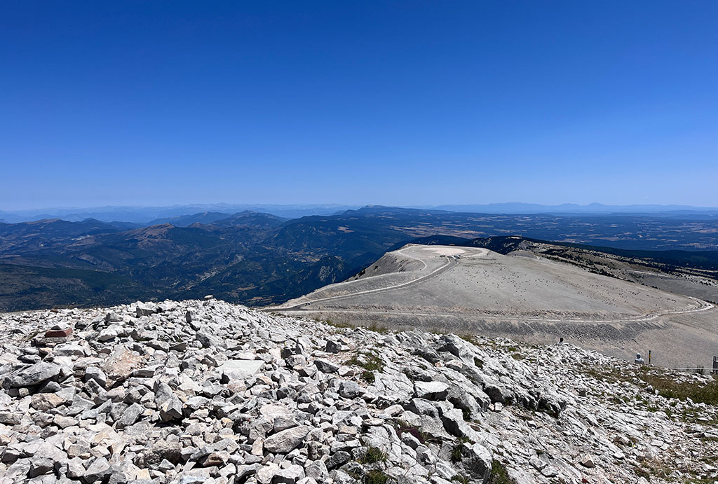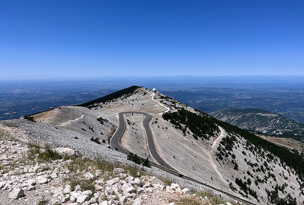 Unser nächstes Ziel ist der Mount Ventoux mit seinen 1909 Metern Höhe. Auf dem Weg dorthin verändert sich die Landschaft. Wir fahren durch Wälder und Schluchten mit schroffen Felsen. Schließlich schlängelt sich eine enge Straße den Berghang hinauf, Schafe grasen rechts und links. Der einst baumbestandene Gipfel zeigt sich heutzutage komplett kahl. Etliche Radfahrer sind unterwegs und kämpfen sich mühsam aufwärts. In ein paar Tagen wird eine Etappe der Tour de France hier entlang führen. Oben angelangt bietet sich heute ein fabelhafter Ausblick bis in die französischen Alpen hinein. Wir spazieren einmal um die Spitze herum und treten unsere Rückfahrt über die kleine Gemeinde Sault an. Das Dorf ist bekannt für seine Lavendelfelder. Einige sind schon abgeerntet, aber ein paar stehen noch in voller lilafarbener Blüte.