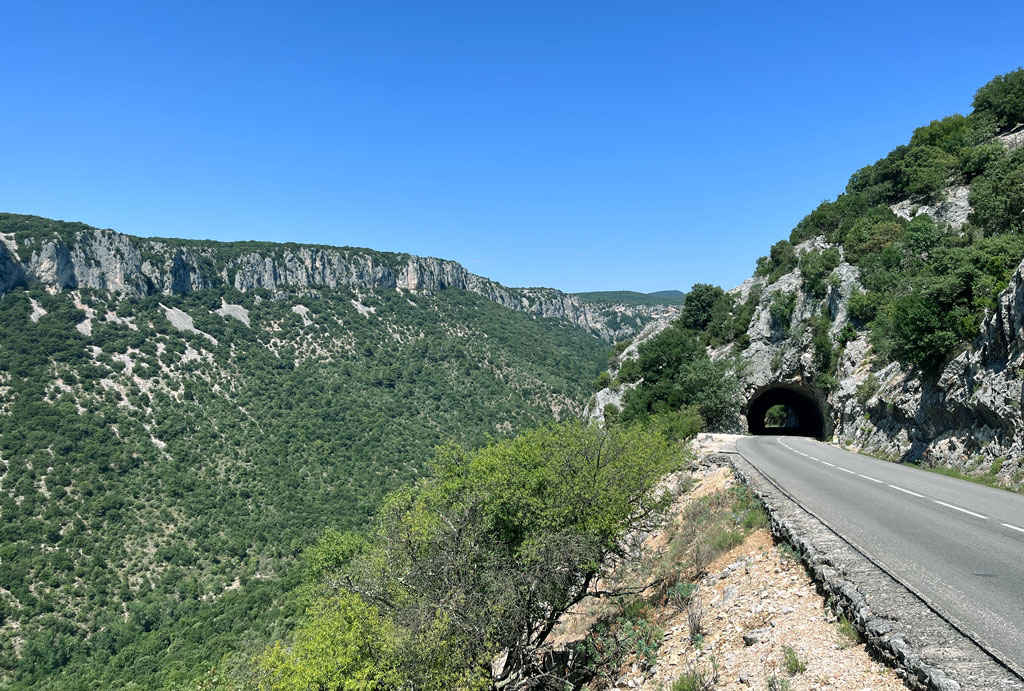Zurück fahren wir über die Panoramastraße D 290, die Aussichtspunkte mit atemberaubendem Blick auf die Ardèche-Schlucht bietet und nach vielen Kurven und mehreren Felstunneln erblicken wir die natürliche Steinbrücke »Le Pont d‘Arc« .