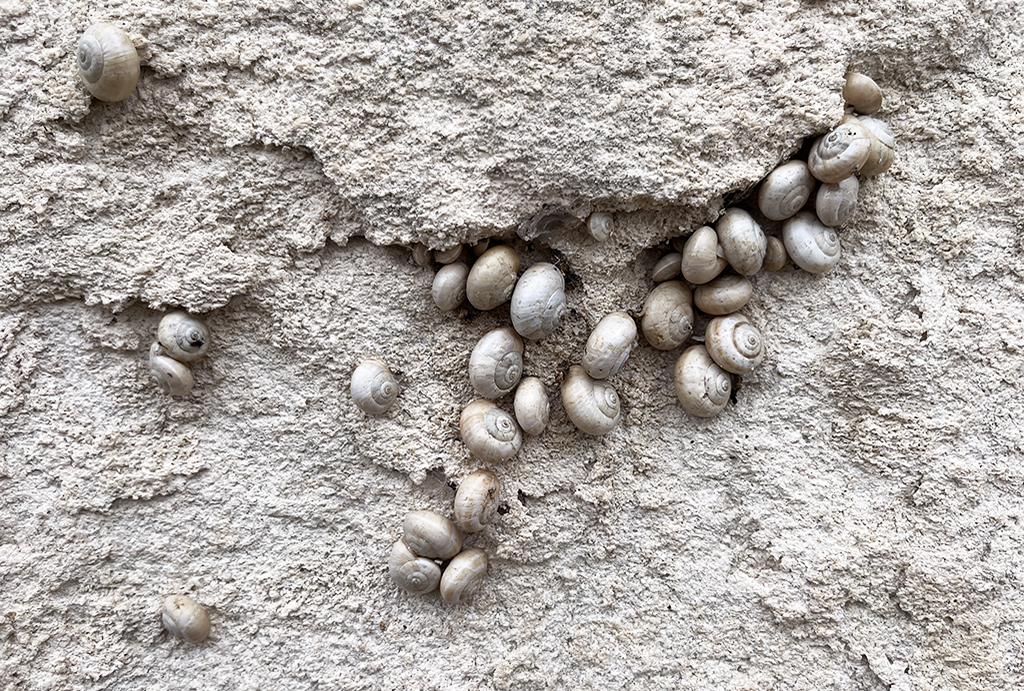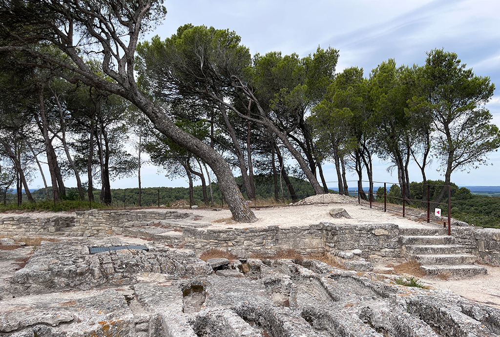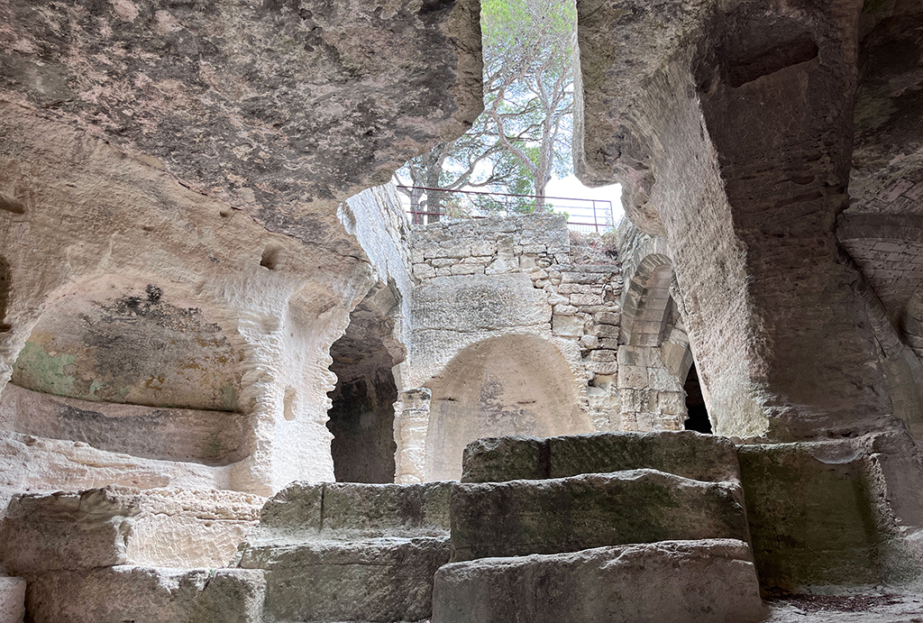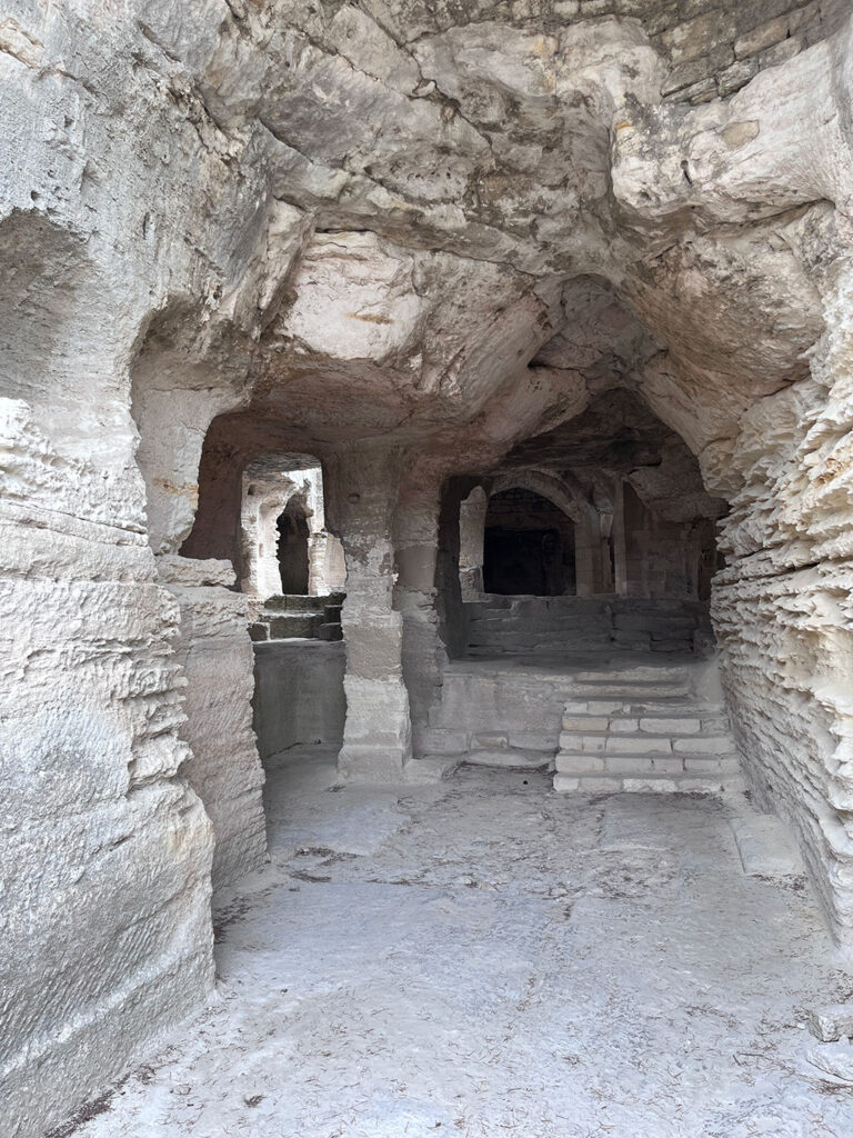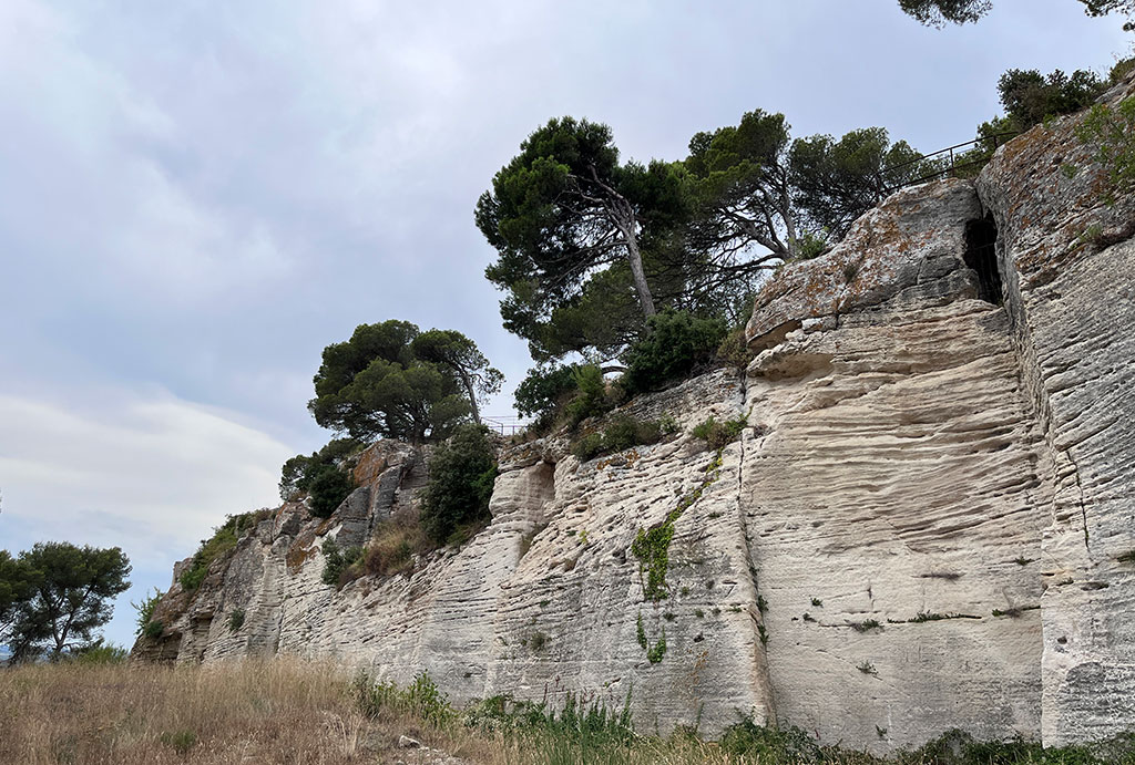Nach unserer etappenweisen Anreise in ein wunderschönes Kalksteinhaus im malerisch auf einem Hügel gelegenen Lagnes in der Provence, starten wir unseren Tag nach einem ausgiebigen Frühstück auf der Dachterrasse mit einer einstündigen Fahrt nach Beaucaire zur Besichtigung der alten Klosterruine „Abtei von Saint-Roman“. Die Strecke verläuft auf von blühenden Oleandersträuchern gesäumten Straßen und vorbei an großen Obstplantagen und riesigen Sonnenblumenfeldern. Vom bewachten Parkplatz aus gelangen wir nach einem etwa 10-minütigen Spaziergang durch die hier typische Garrigue-Landschaft (mediterrane Strauchheide), vom steten Singen der Zikaden begleitet, hinauf auf den Gipfel des Hügels, auf welchem sich das Höhlenkloster einst erhob. Die in Stein gehauenen Mauerreste von Kapelle, Weinkeller oder Mönchzellen zeugen vom klösterlichen Leben der ehemaligen Bewohner. Der Friedhof auf dem oberen Teil des Felsens enthält die Überreste unzähliger in Körperform ausgearbeiteter Gräber. Bei einer Runde um die Anlage herum genießen wir den traumhaften Ausblick und entdecken unterschiedliche Heuschreckenarten sowie zahllose kleine Schnecken, die es sich an dem alten Gemäuer gemütlich gemacht haben.